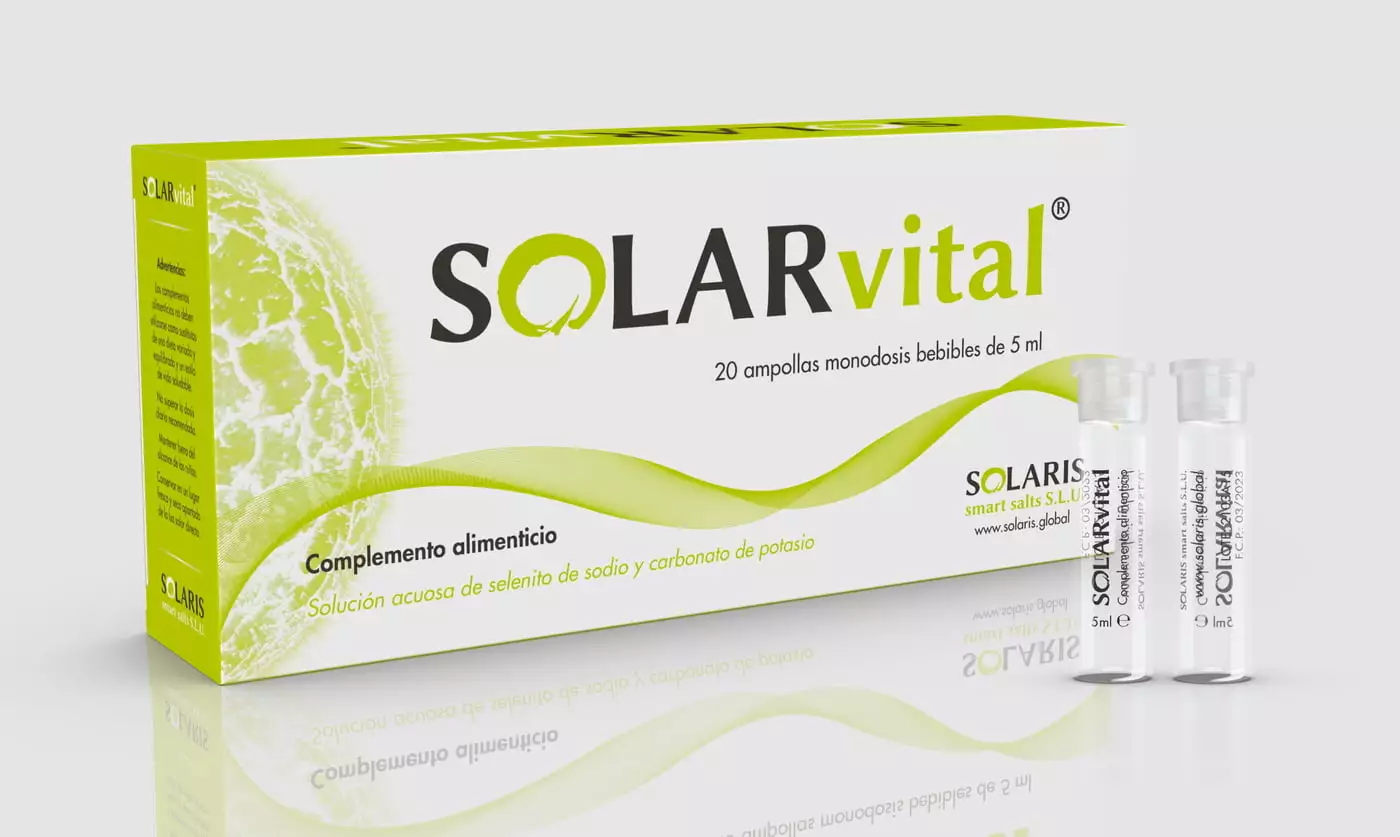 SOLARvital es un complemento alimenticio formulado como solución acuosa a base de selenito de sodio (fuente de selenio) y carbonato de potasio, presentado en viales monodosis bebibles de 5 ml para una dosificación precisa y un uso cómodo.